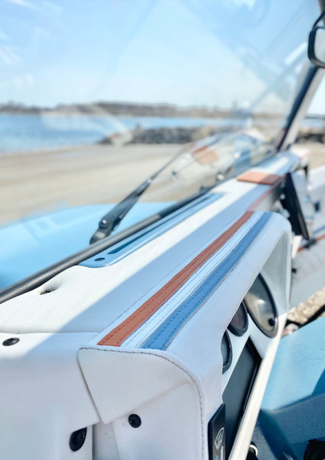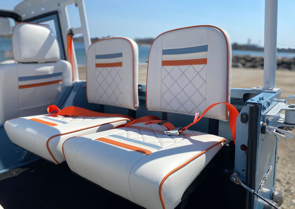 Custom Seats: Front and rear seating fully reupholstered in white with coordinated sky-blue and tangerine contrast stitching and stripe accents.